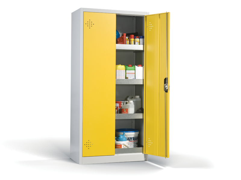 Minden szekrénybe horganyzott lemezből készült, magas oldalfalú, biztonságosan rögzített kármentő tálcák kerülnek. A szekrény masszív, az ajtók biztonságos módon, 3 ponton záródnak. A fokozott szellőzést az ajtók sarkaiban elhelyezett perforáció segíti.